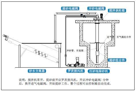 由于葉輪葉漿向上傾斜,旋轉(zhuǎn)時將使池中的污水呈螺旋狀加速,形成渦流態(tài),產(chǎn)生留心力。同時池內(nèi)污水流在葉輪葉片攪拌剪切力的作用下,互相剝離,依靠砂的自身重力和旋流的離心力,使砂粒沿池壁呈螺旋線加速沉降,向中心砂斗積聚,經(jīng)氣提或泵提升后排出池外作進(jìn)一步的處理。在此過程中,適當(dāng)?shù)臉~角度和線速度條件,使污水中的砂粒受到?jīng)_刷,并保持好的沉降效果,而原來粘附在砂粒上的有機物,以及重量其它小的物質(zhì),隨污水一同流出旋流沉砂池,進(jìn)入后續(xù)工序繼續(xù)處理,砂與少量污水進(jìn)入池外砂水分離器內(nèi),砂經(jīng)分離后外排,污水回流至格柵井。
