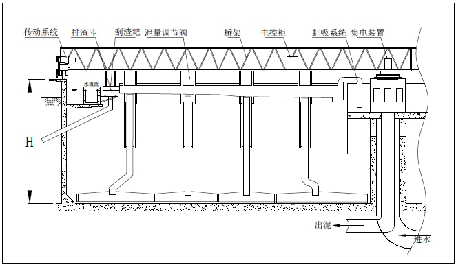 ZBX型周邊傳動吸泥機主要由穩(wěn)流筒、集電裝置、中心支座、工作橋(主梁)、吸泥結(jié)構(gòu)、排渣機構(gòu)、驅(qū)動裝置、虹吸系統(tǒng)、集泥罐、行走裝置和電控箱等部分組成。